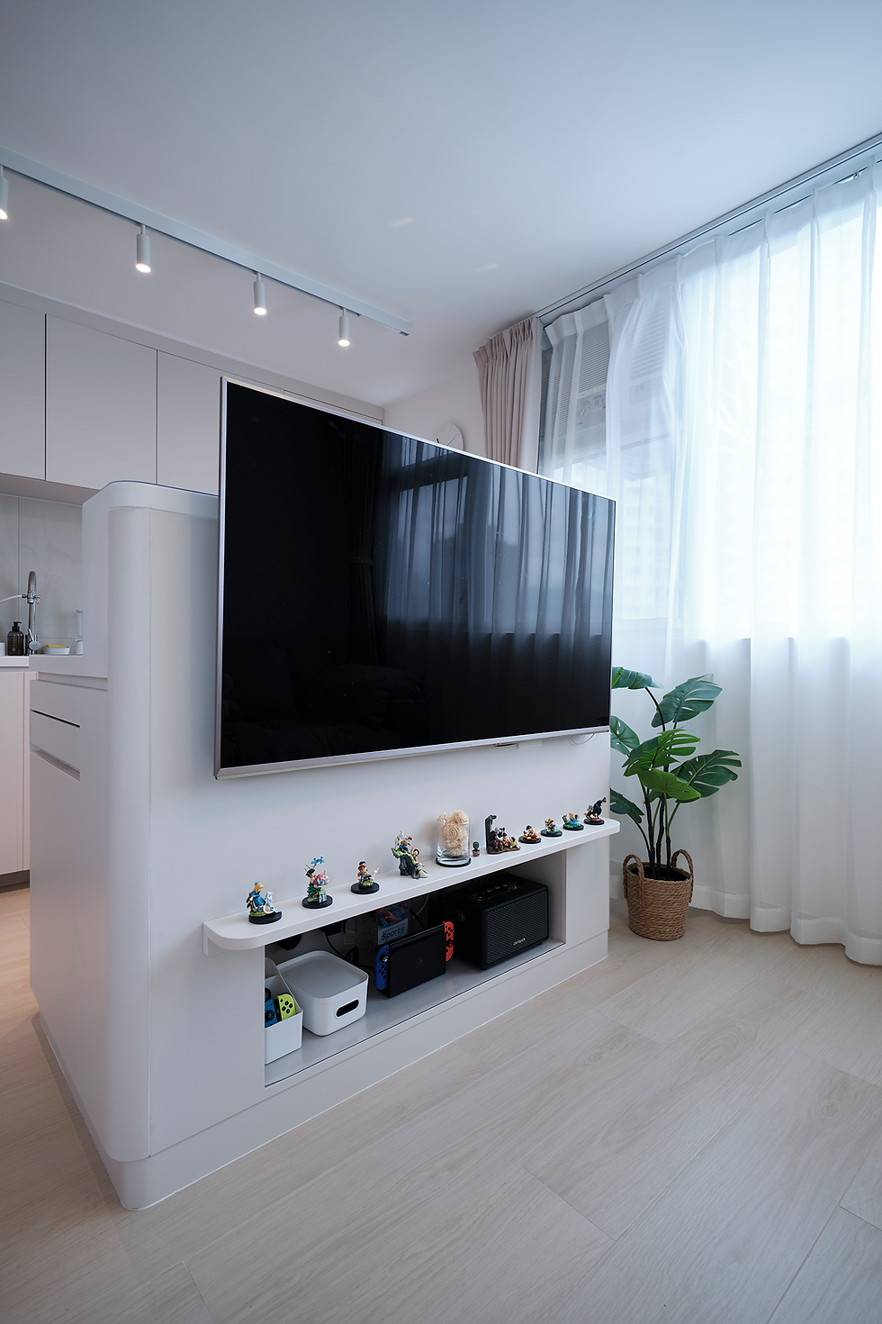 特別設計的中島同時充當掛牆電視櫃。