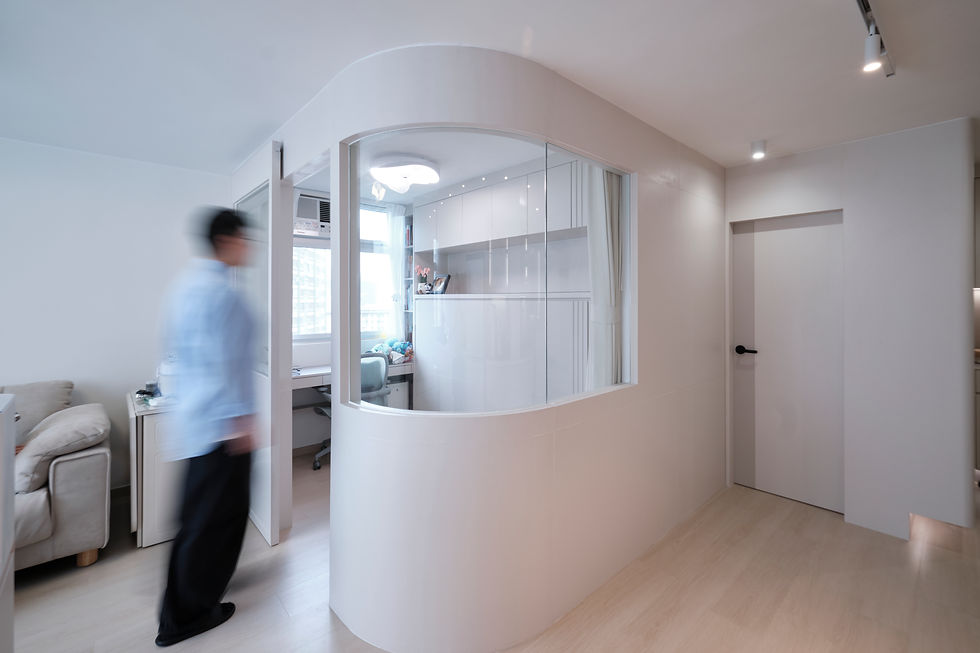 戶主不時需要在家工作,因此需要安排書房。我們進一步延伸室外的陽光,特別設計弧形的半牆玻璃書房。配合書房桌前的小窗戶,日間即使不亮燈,也有充足的照明。